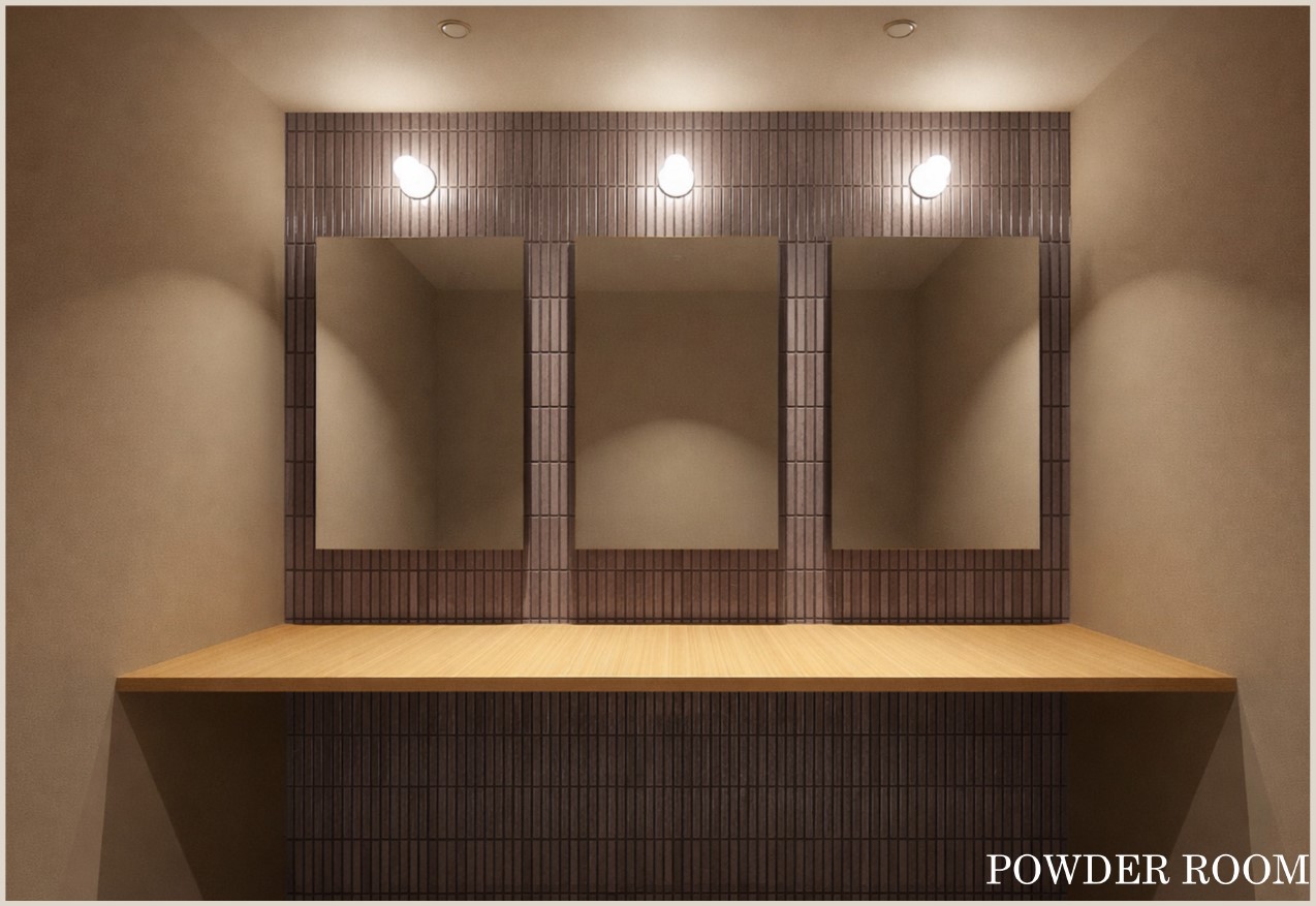 柔らかなベース壁と石調の床、温もりのある木の質感が重なり合い、光は強く主張することなく、壁面をなぞるように静かに広がります。