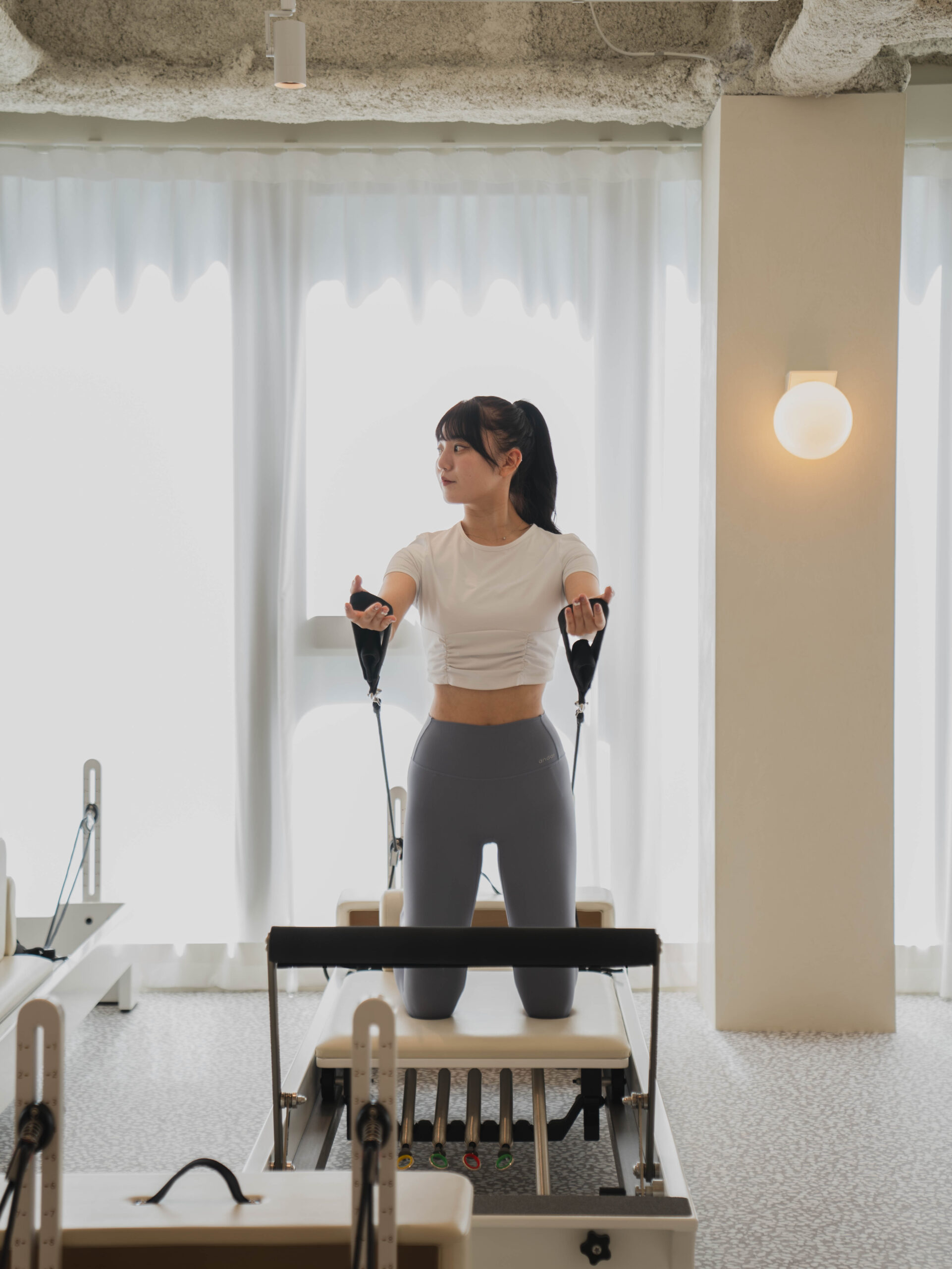 マシンの使い方、呼吸や姿勢などピラティスの基礎から始まり、